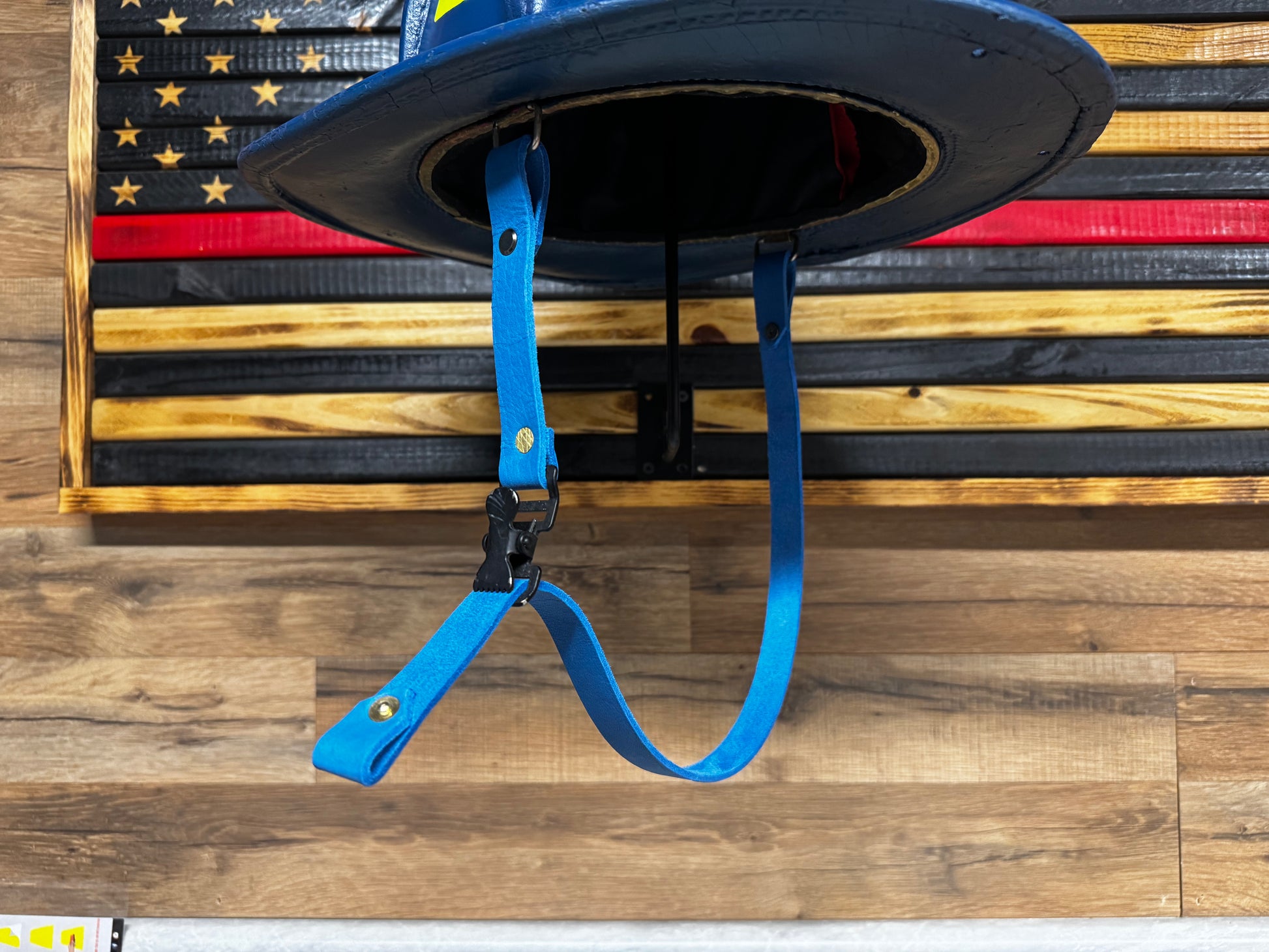 The chinstrap measures 32 inches. There very comfortable and soft leather.